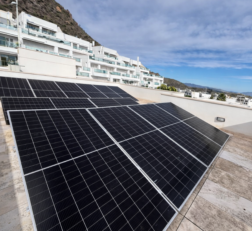Instalación fotovoltaica sobre cubierta plana en entorno residencial, con una distribución de módulos diseñada para aprovechar eficazmente la superficie útil y mejorar el rendimiento global del sistema.